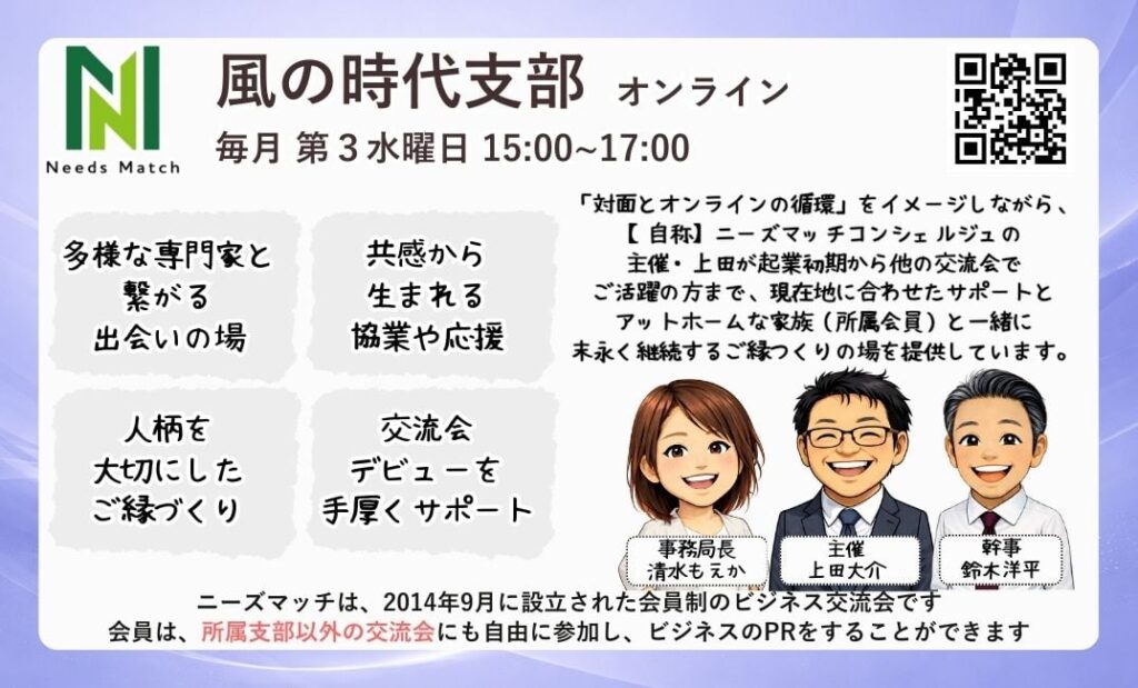 そんなあなたにぴったりの場所が、ニーズマッチ オンライン支部『風の時代支部』(主催:上田大介さん)です。